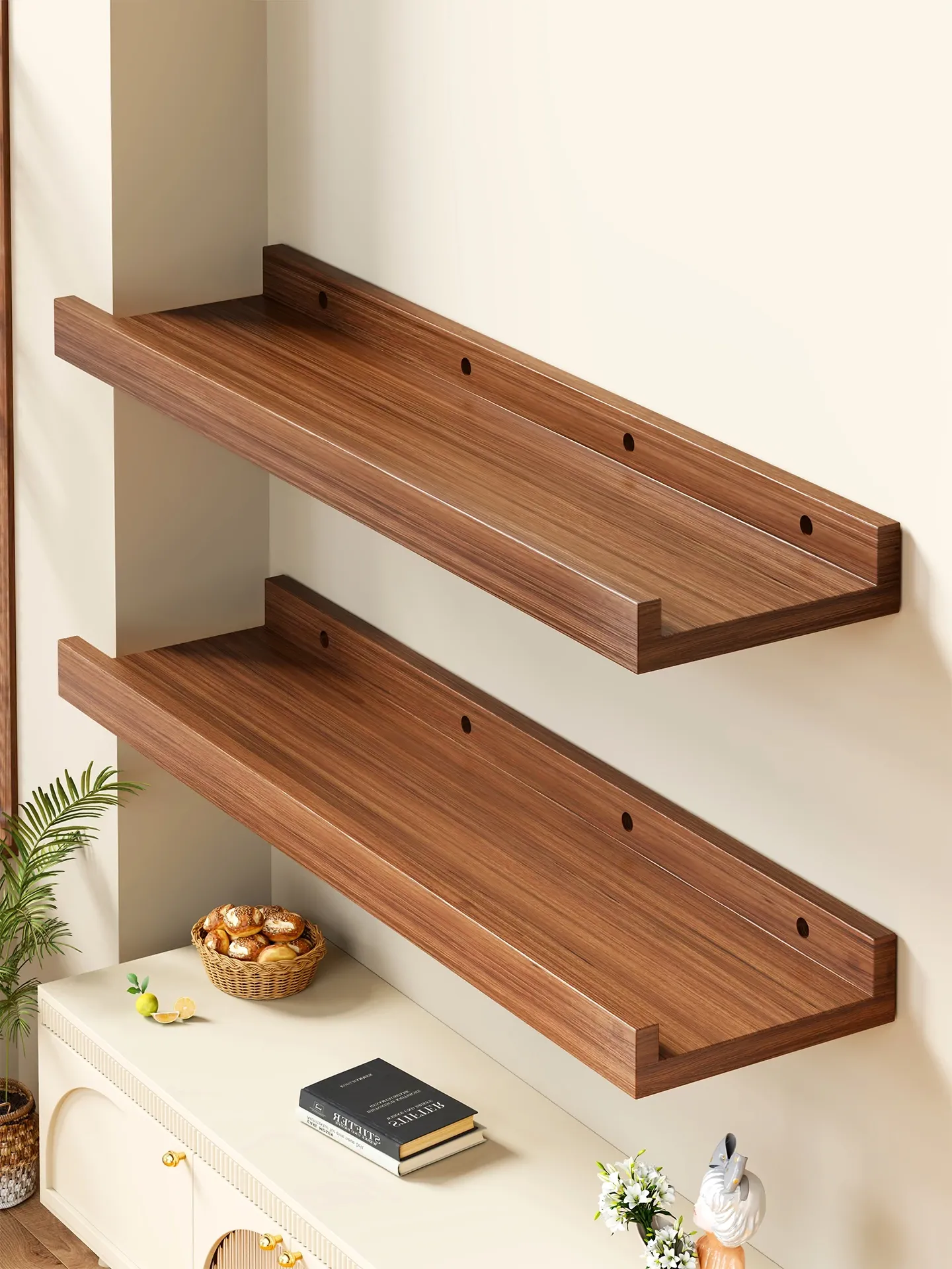 天然木製の壁掛けシェルフ - リビングや寝室に最適な一体型デザインで、空間を有効活用!おしゃれで機能的な書籍や小物の収納に最適です。