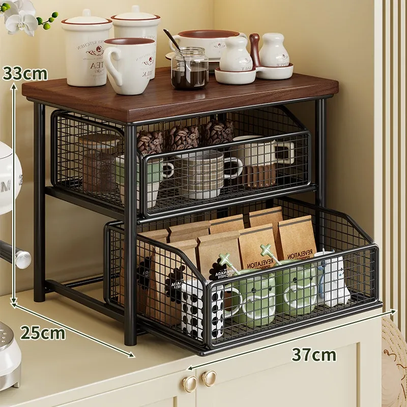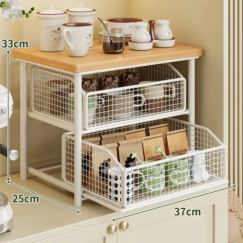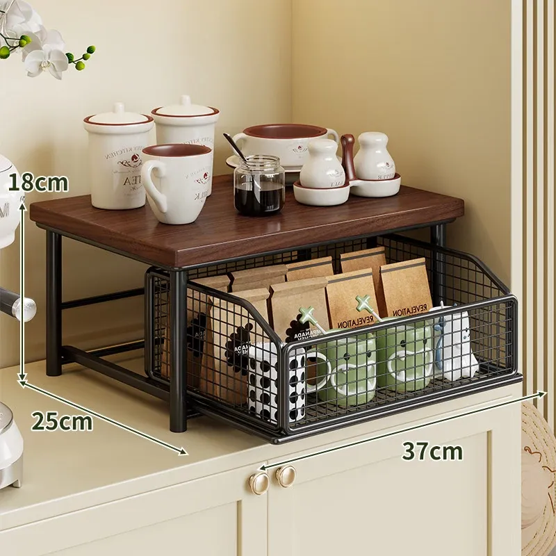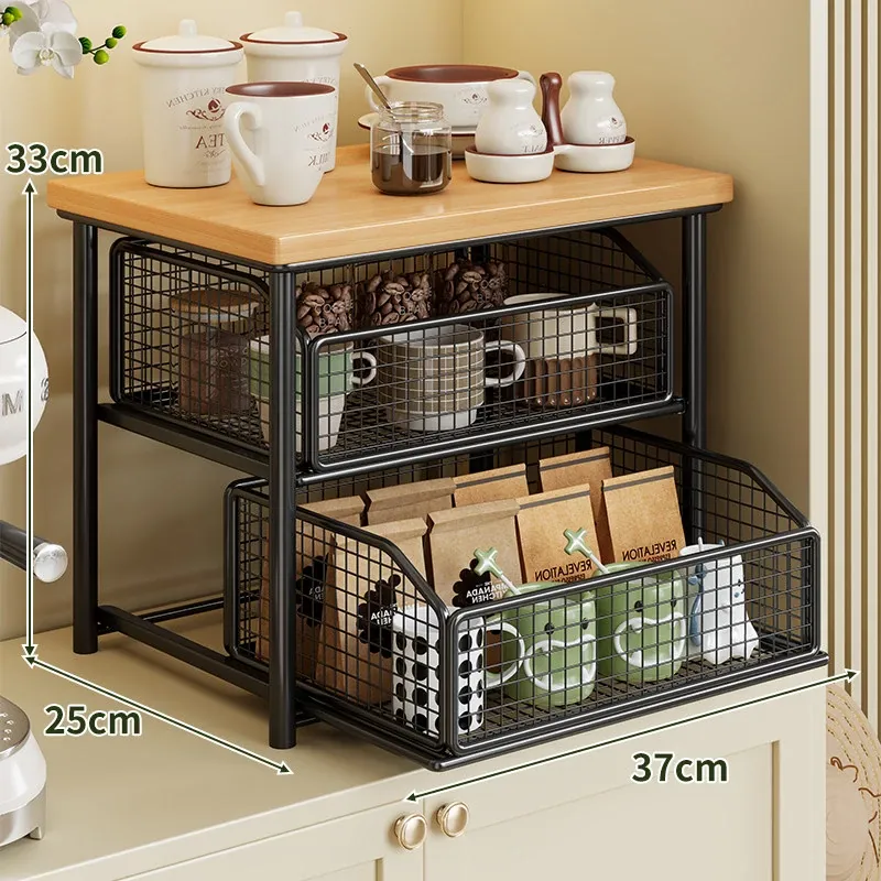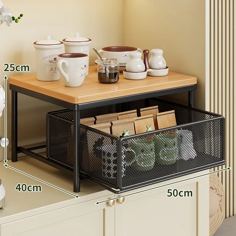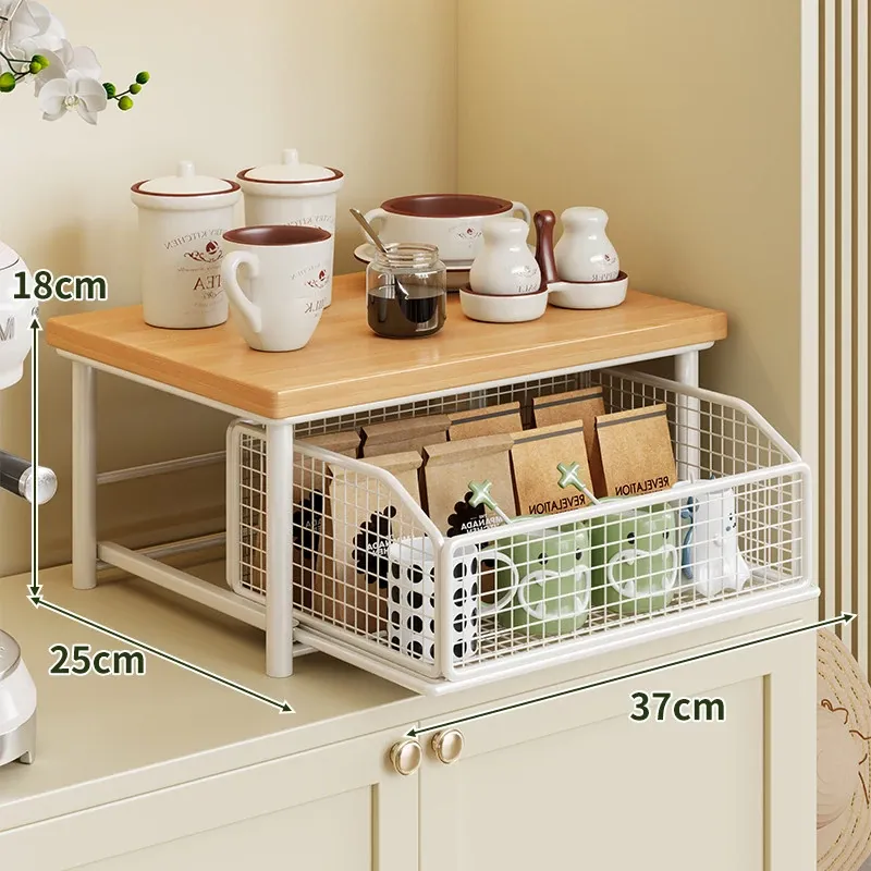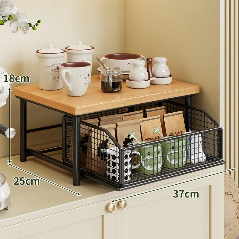 デスクトップ引き出し式収納ラック - 多層コーヒーメーカー&マグカップ整理棚、防塵仕様でティーバッグもスッキリ収納!あなたの作業スペースをおしゃれに整えます!