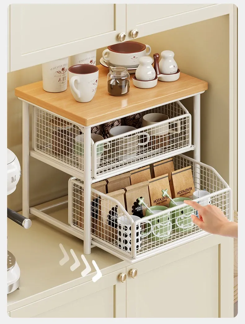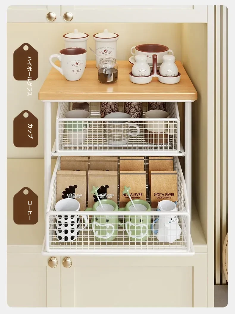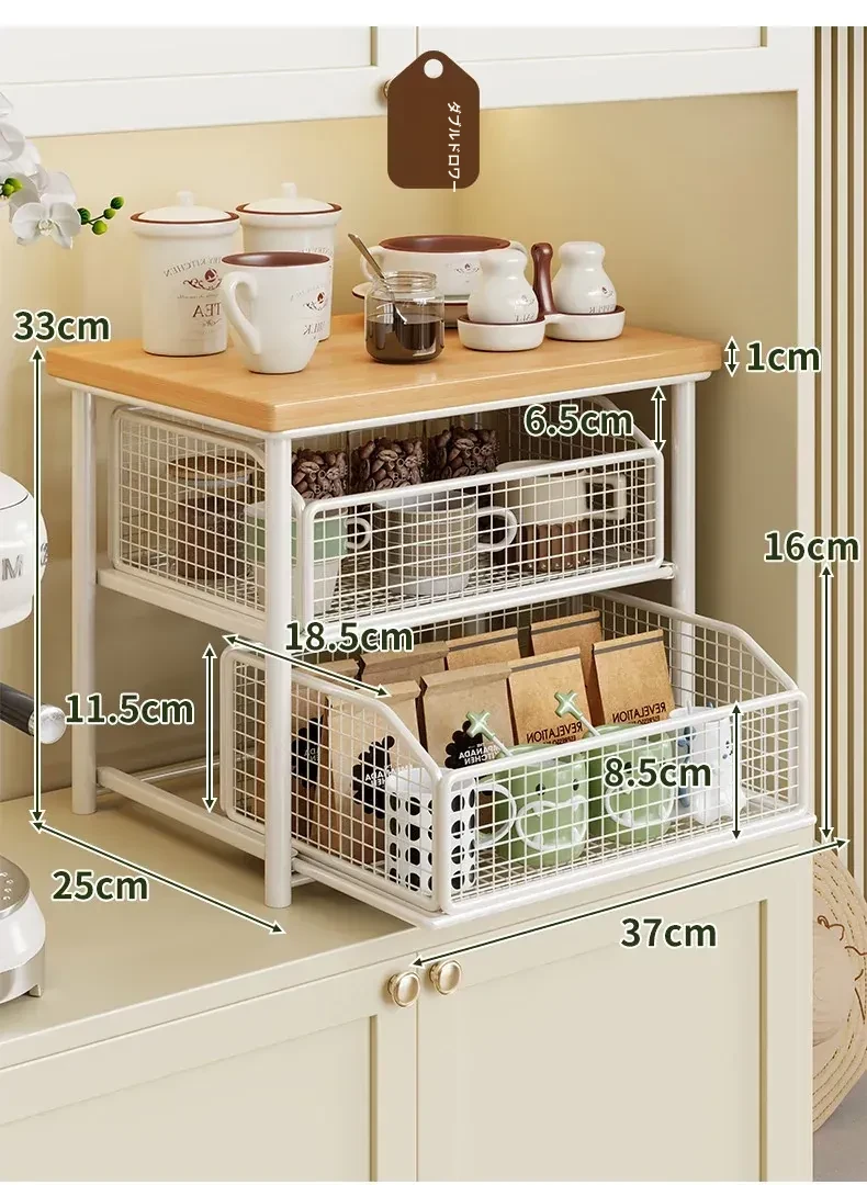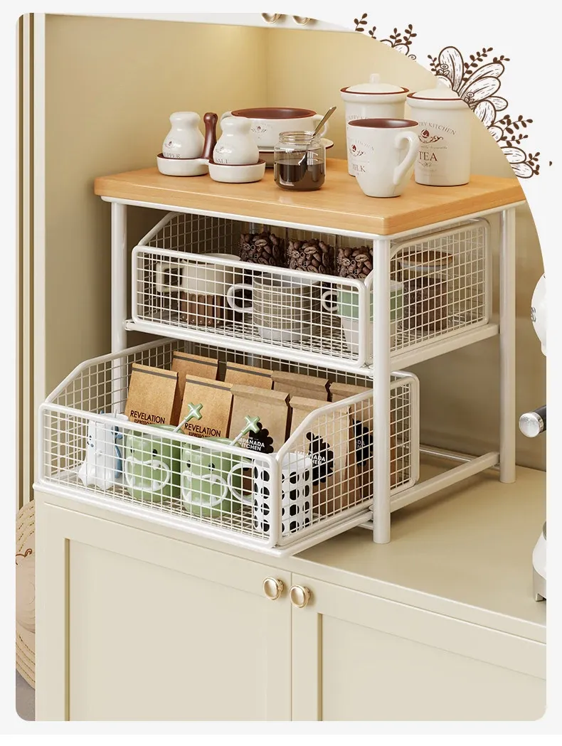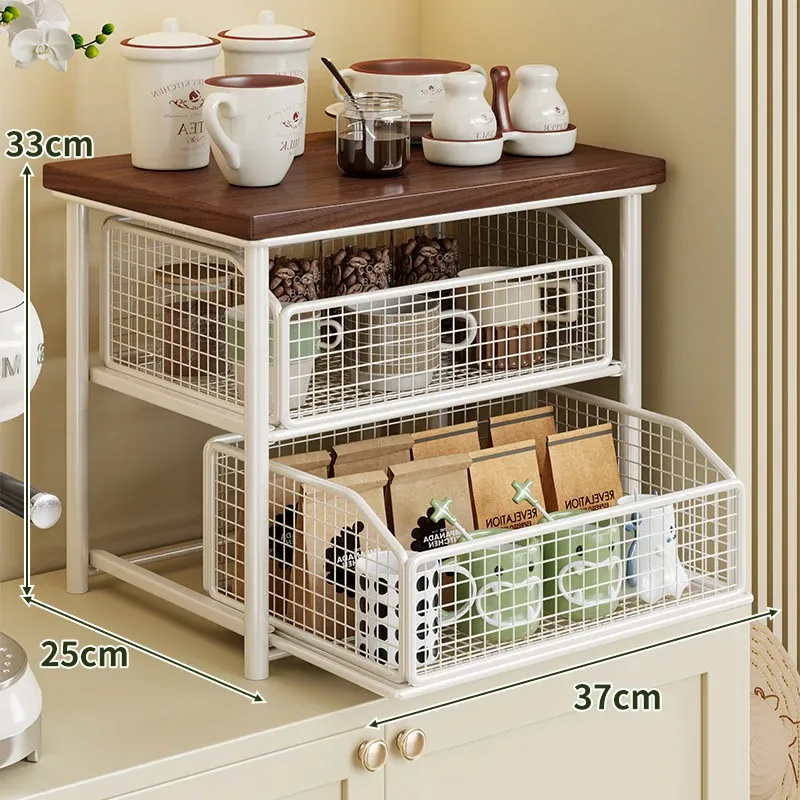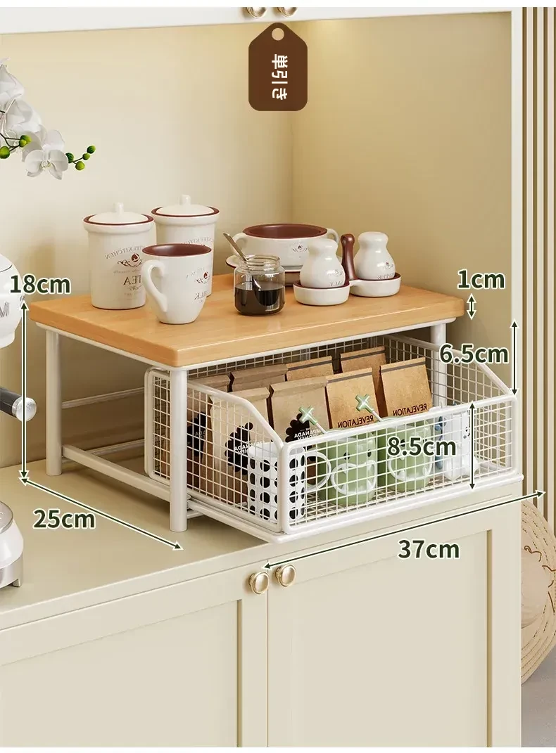 デスクトップ引き出し式収納ラック - 多層コーヒーメーカー&マグカップ整理棚、防塵仕様でティーバッグもスッキリ収納!あなたの作業スペースをおしゃれに整えます!