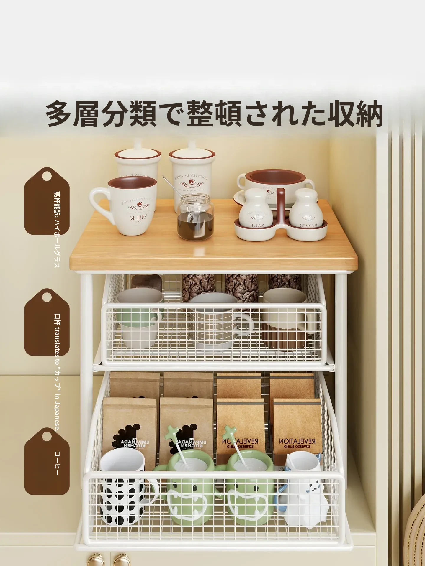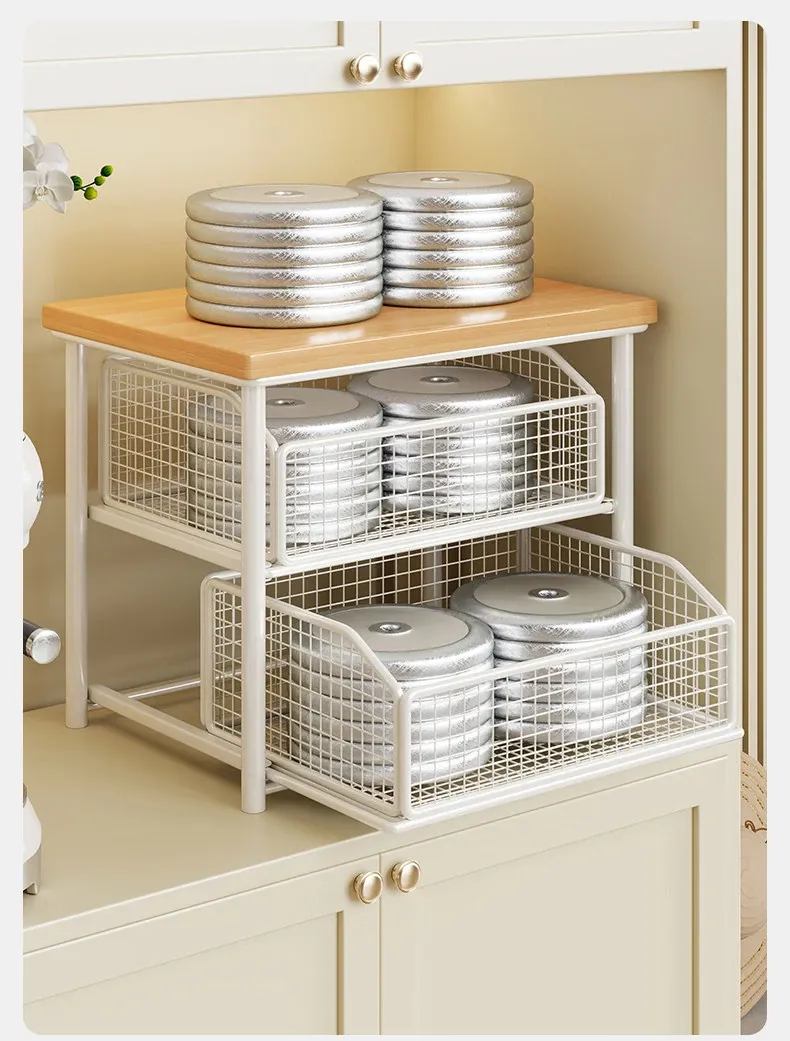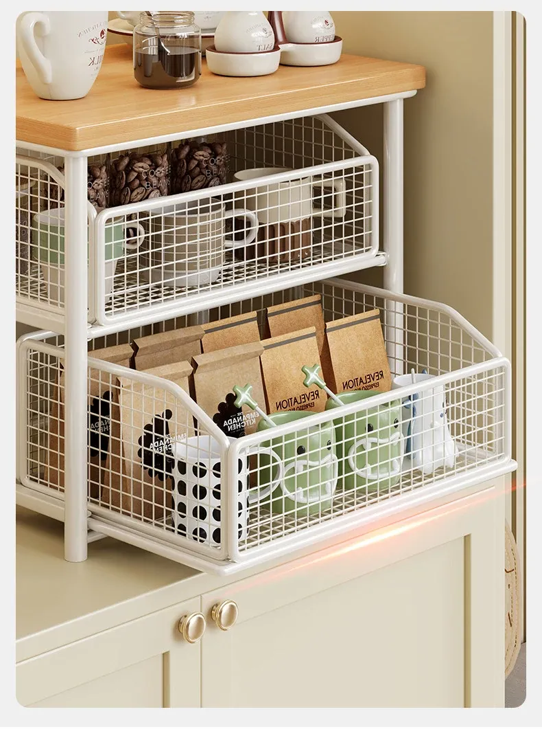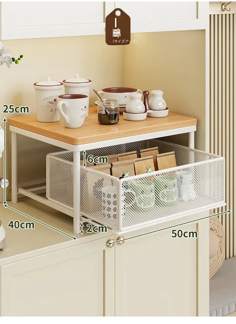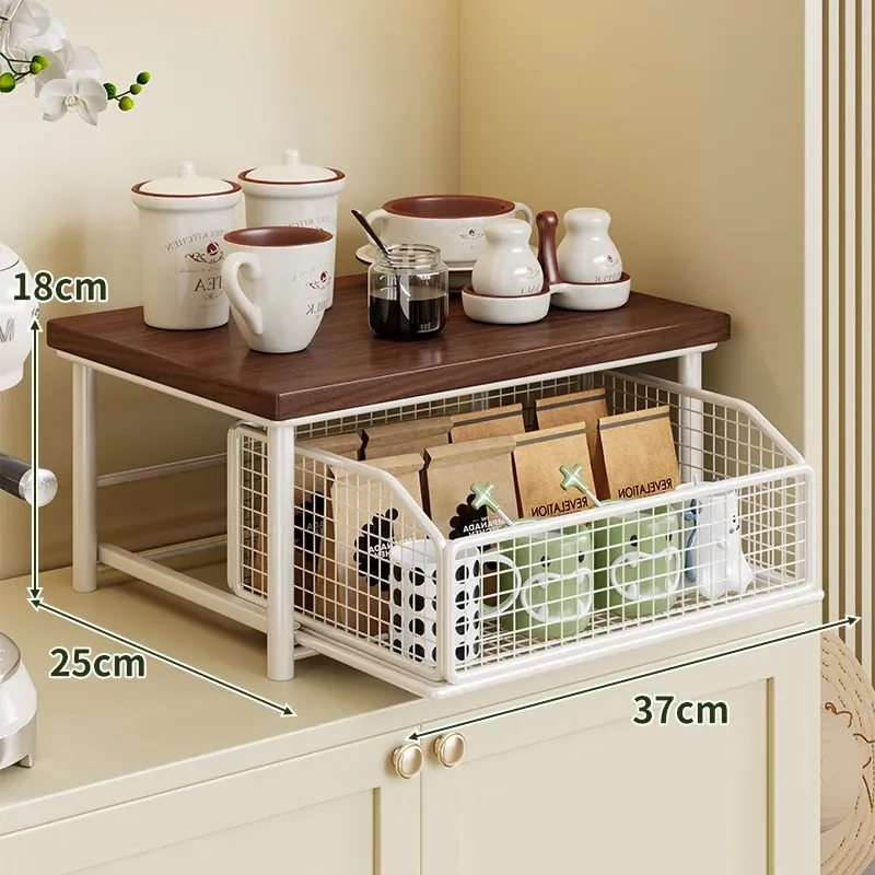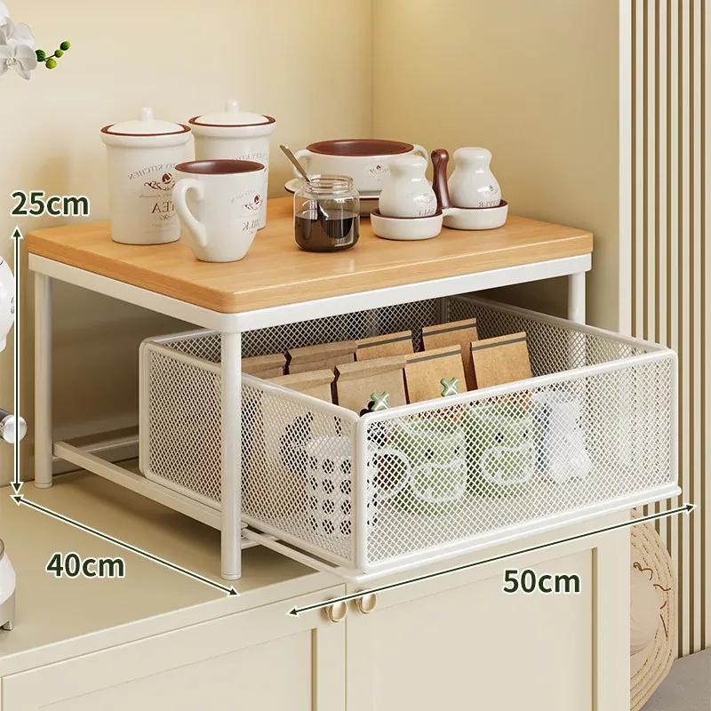 デスクトップ引き出し式収納ラック - 多層コーヒーメーカー&マグカップ整理棚、防塵仕様でティーバッグもスッキリ収納!あなたの作業スペースをおしゃれに整えます!