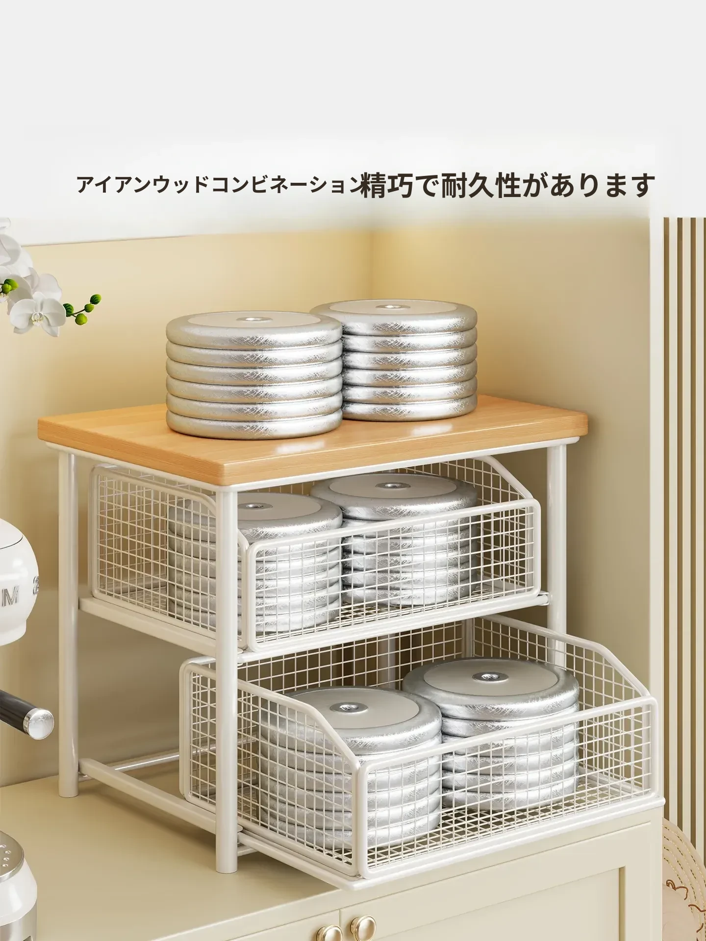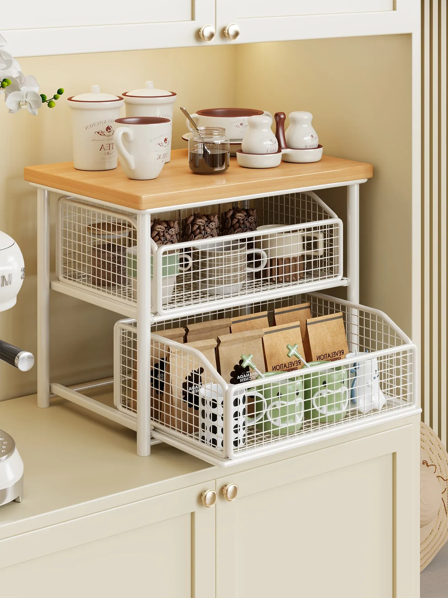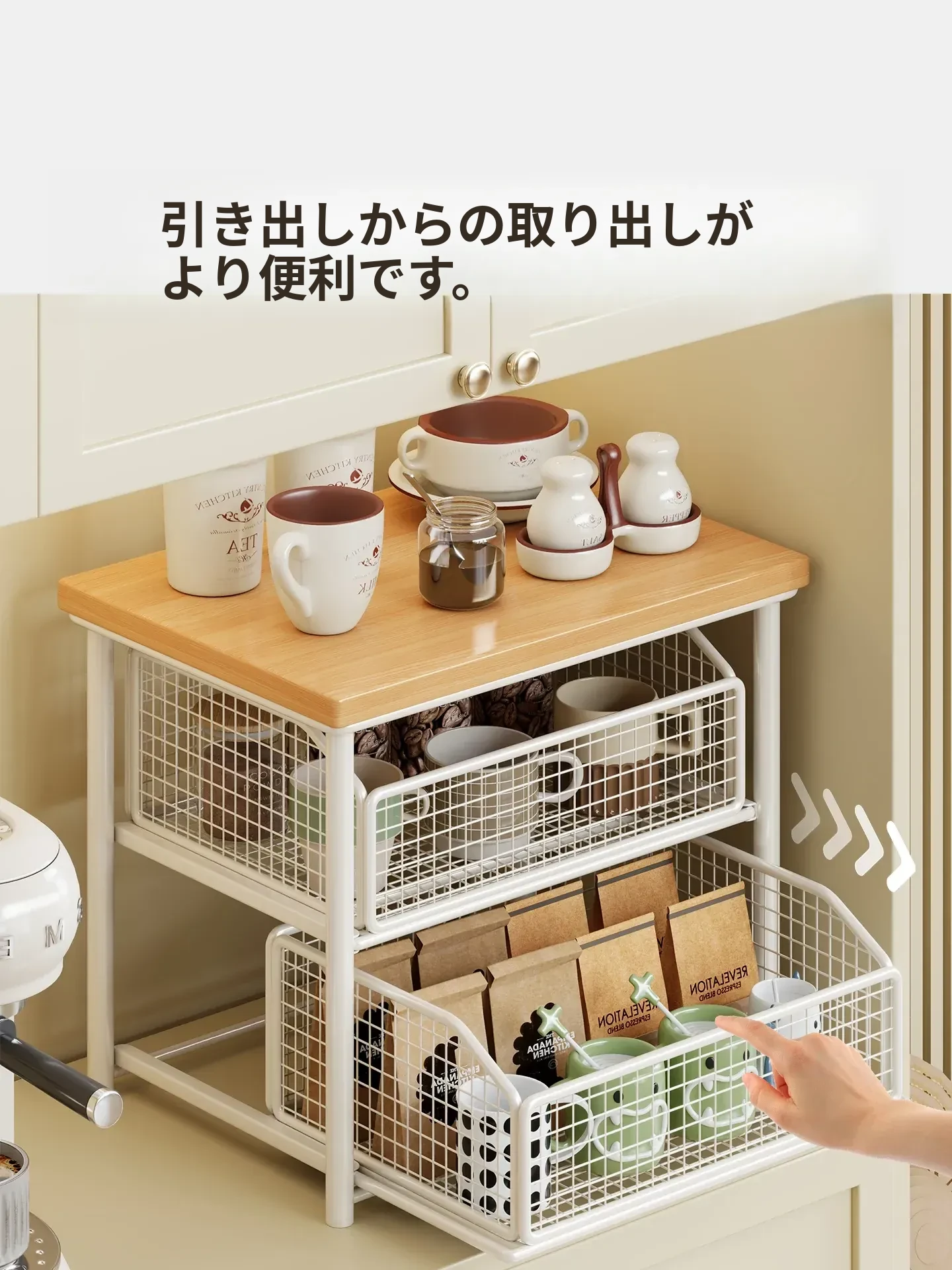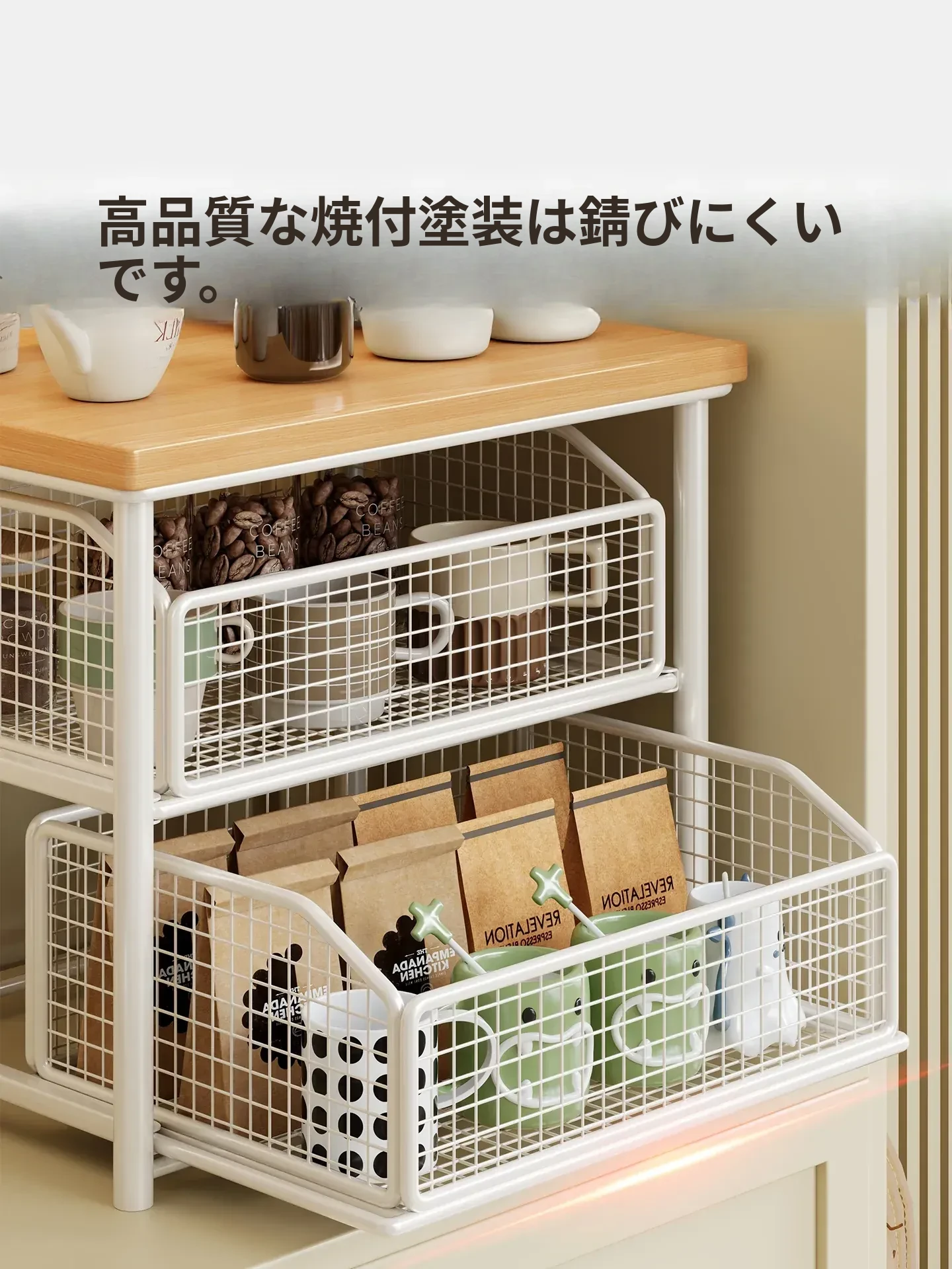 デスクトップ引き出し式収納ラック - 多層コーヒーメーカー&マグカップ整理棚、防塵仕様でティーバッグもスッキリ収納!あなたの作業スペースをおしゃれに整えます!