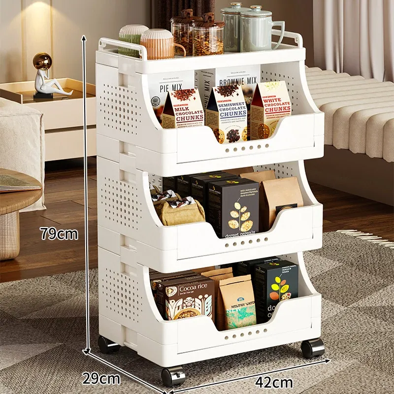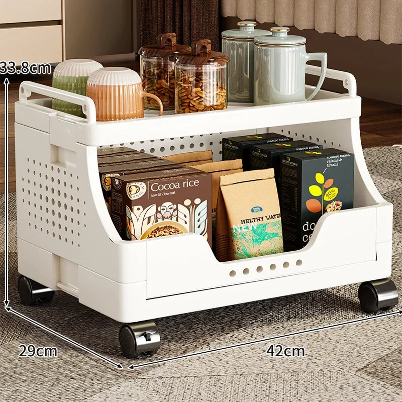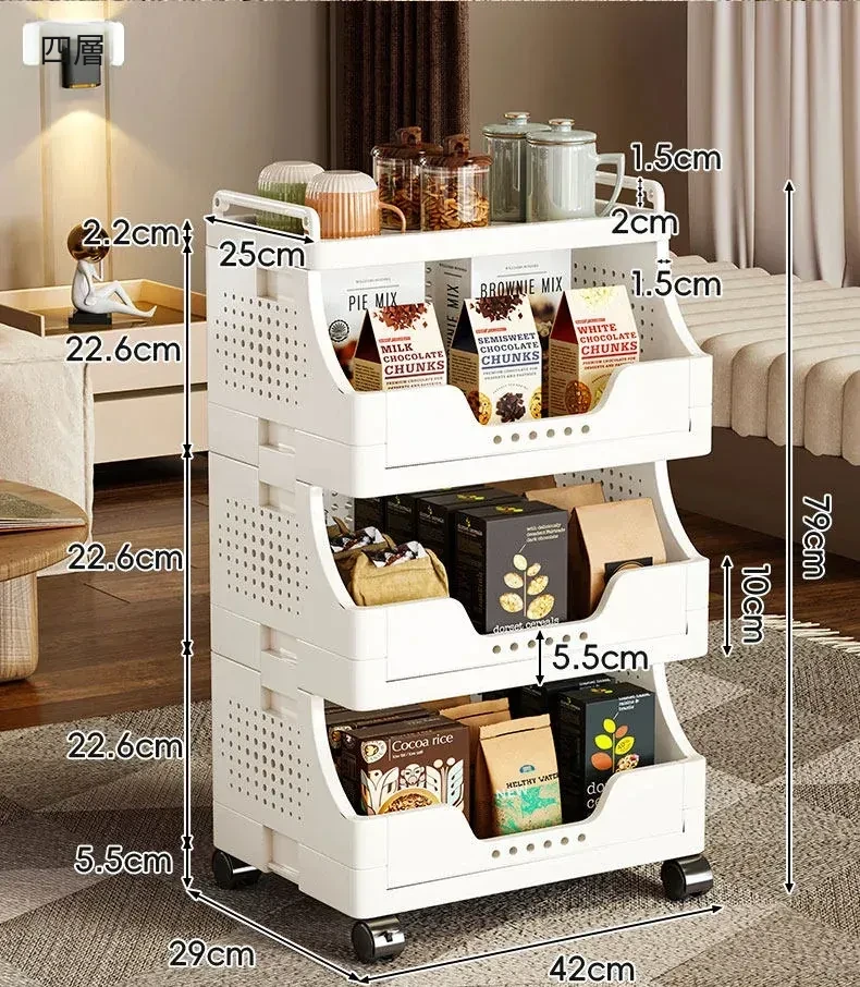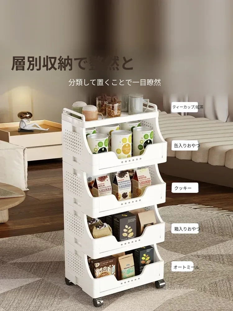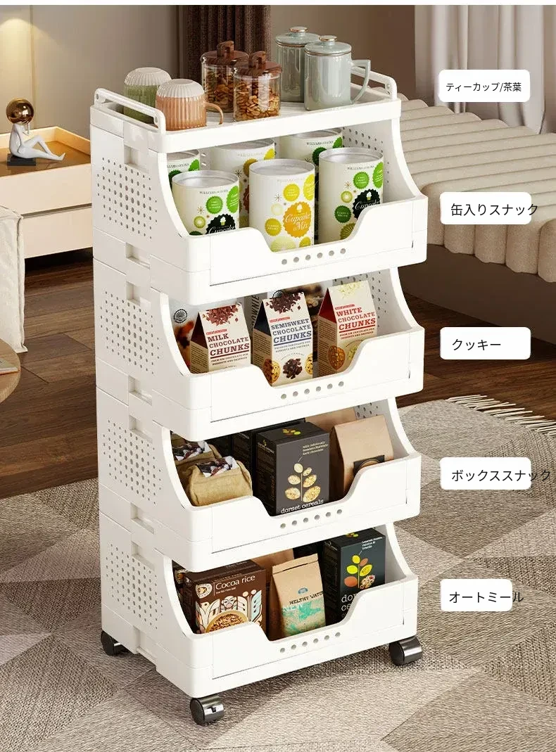 キャスター付き多段式リビングスナック収納ラック - 移動可能な収納カートで、書籍や小物をスッキリ整理!おしゃれで便利なオープンシェルフで、リビングをもっと快適に!