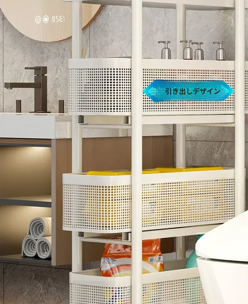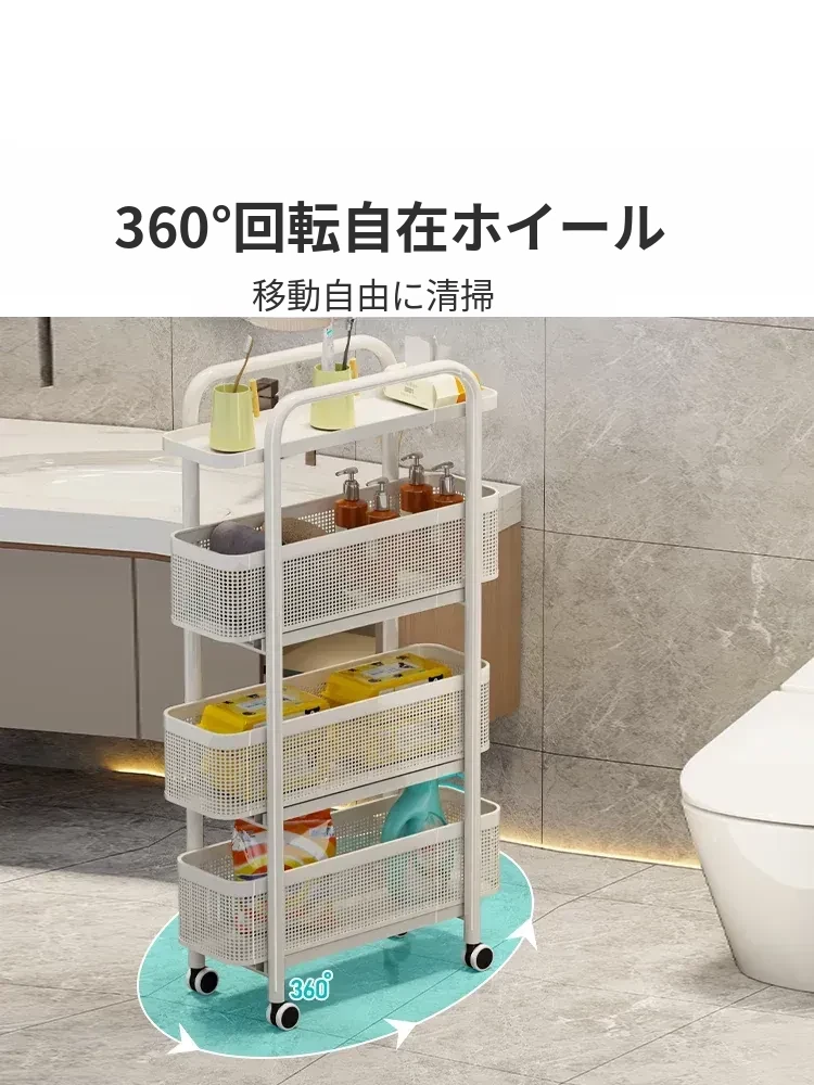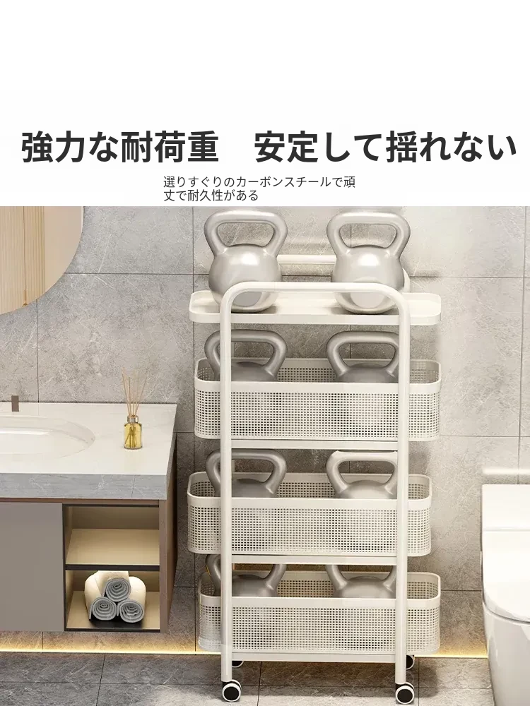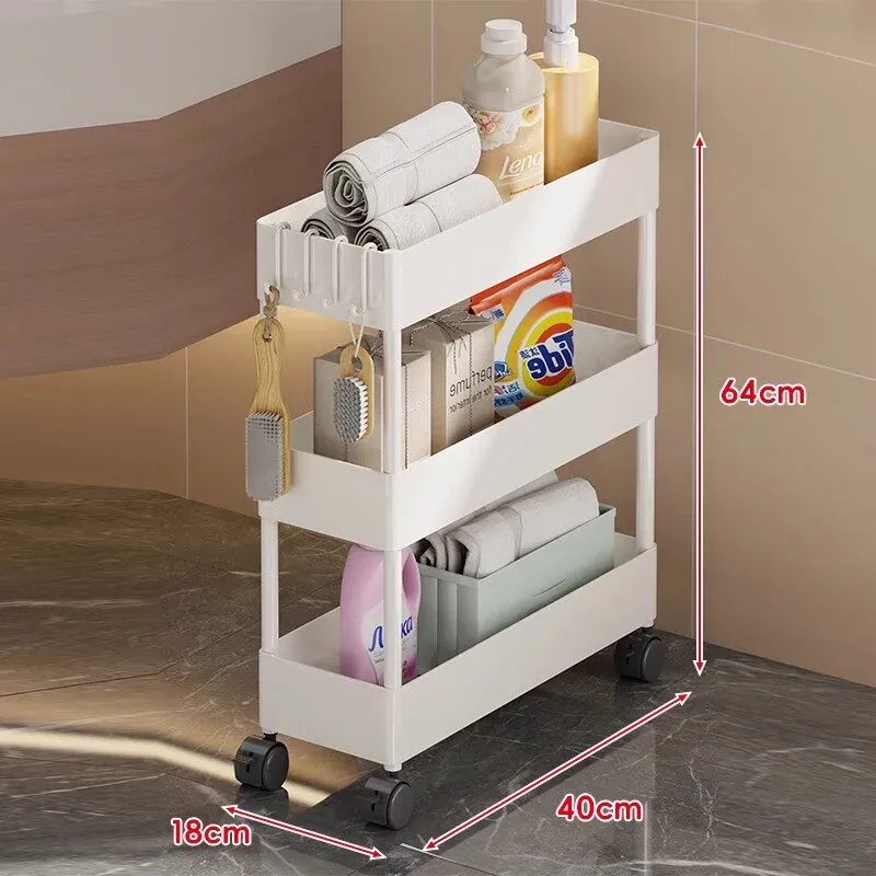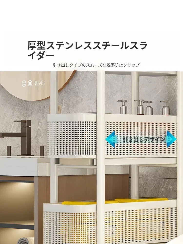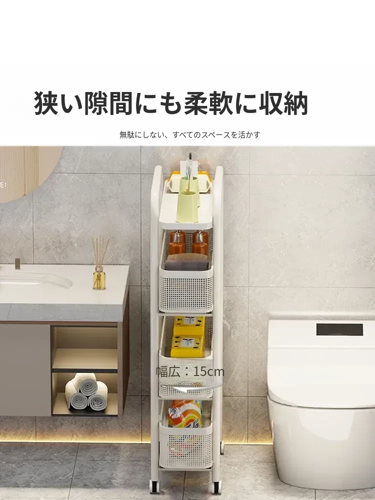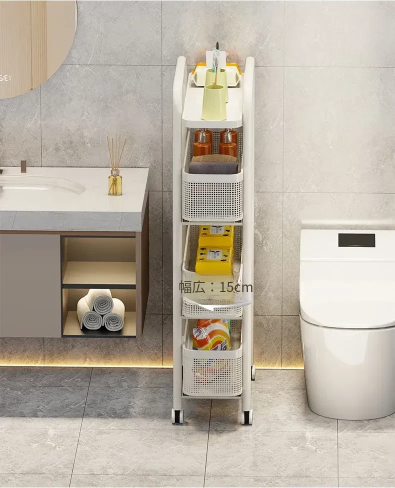 バスルーム用スリム収納ラック - 狭い隙間にもぴったりフィット!超薄型の立てかけ式キャスター付き小型ラック。キッチンやトイレの壁際に最適な収納ソリューション!整理整頓を簡単に実現します。