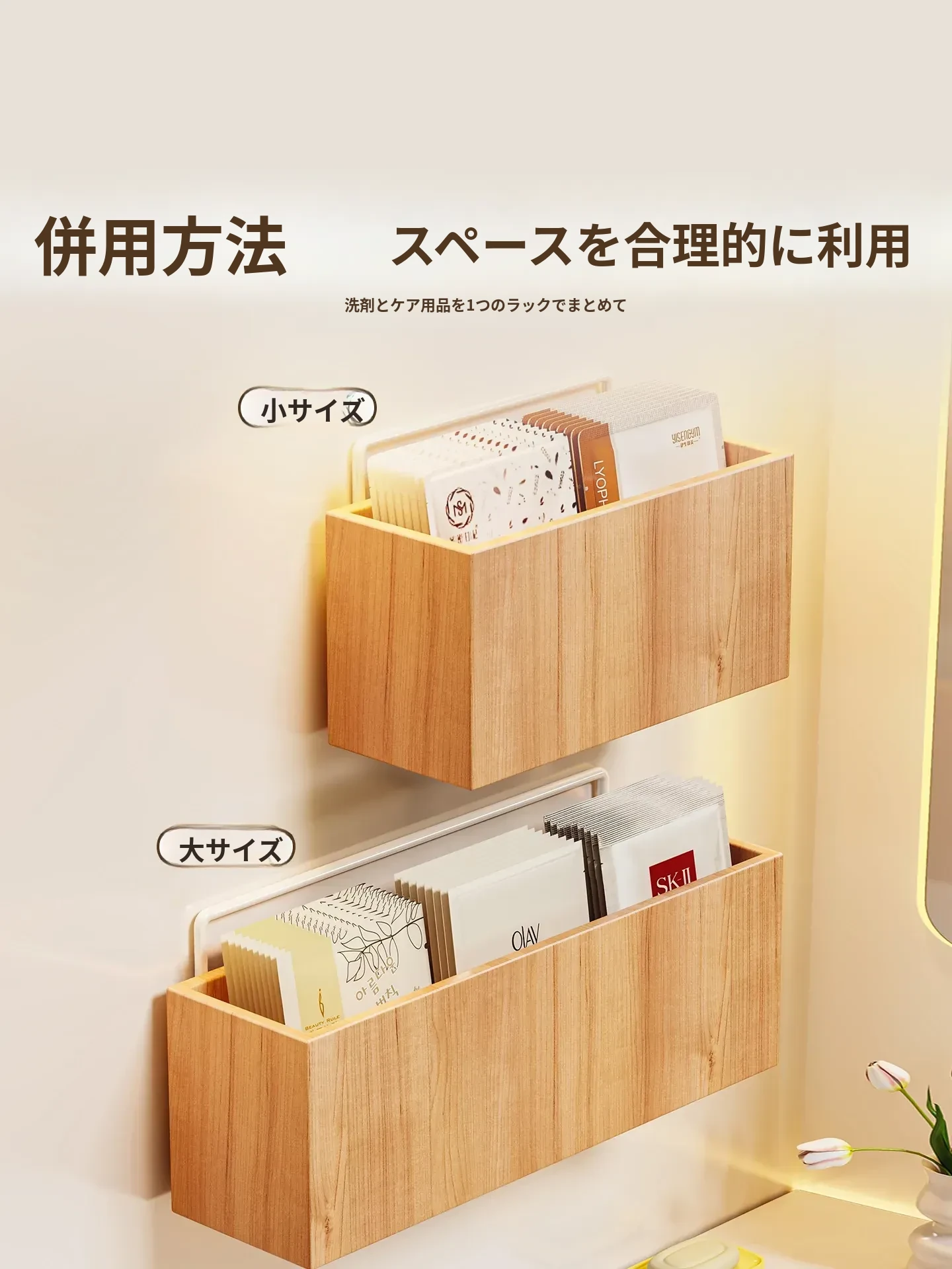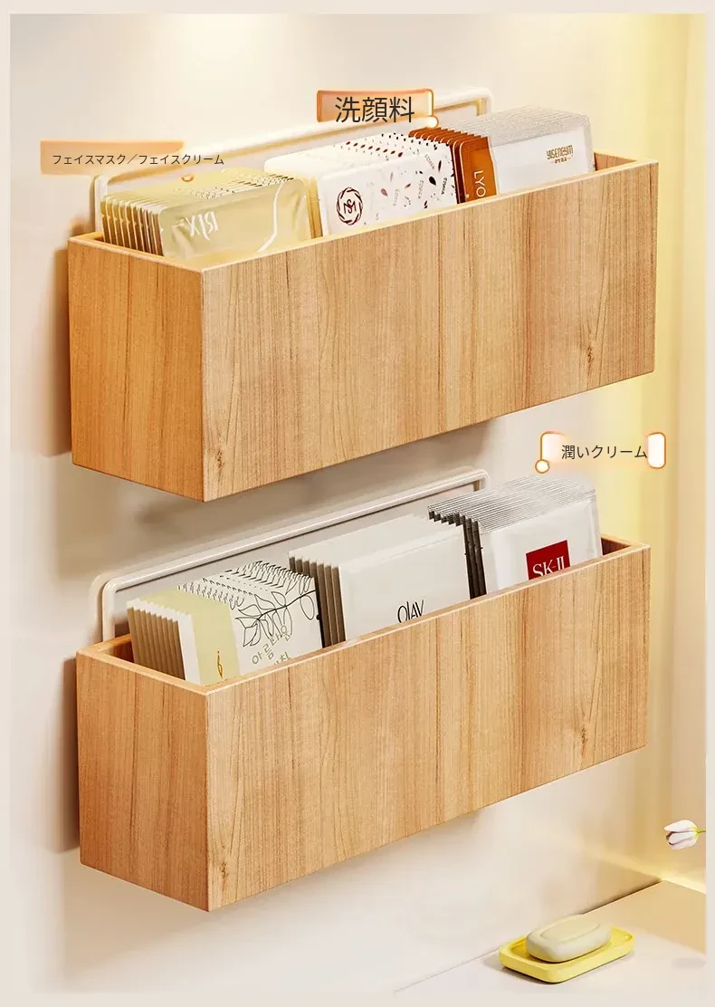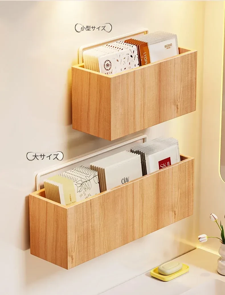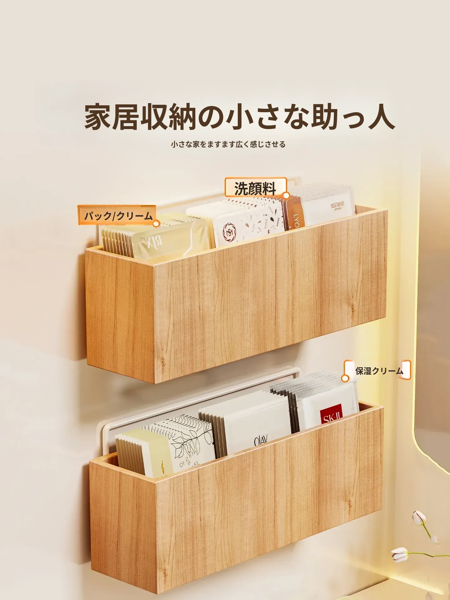 天然木製フェイスマスク収納ボックス&ミラーキャビネット - 化粧品やリップスティックの整理に最適!バスルームの壁掛け収納ラックで、あなたの美容アイテムをスタイリッシュにまとめます。