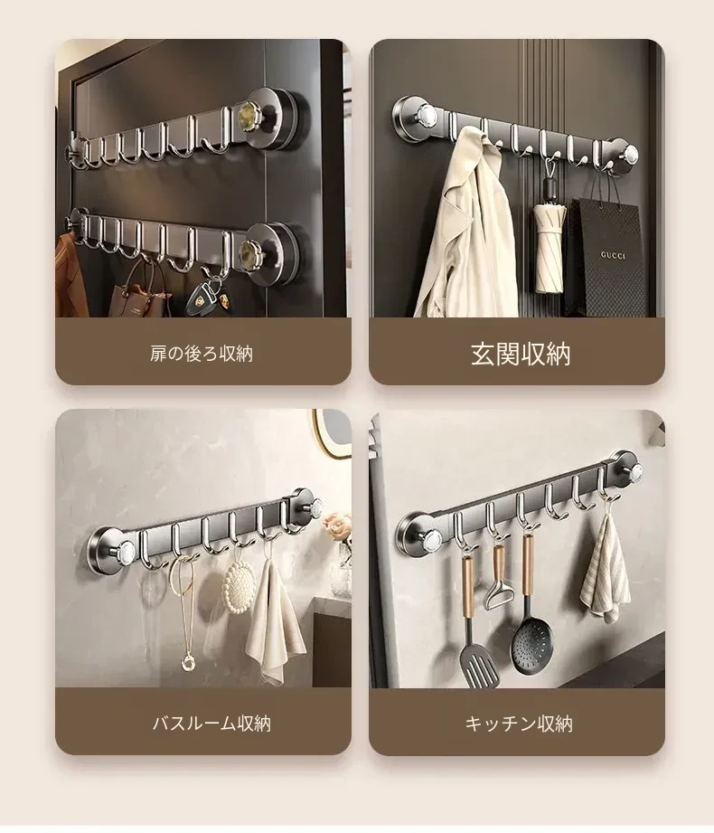 強力吸盤フック!穴あけ不要で簡単取り付け!ドアの裏に最適な衣類掛け、入居者必見の粘着フック。キッチンやバスルームの壁面収納に最適なアイテムです!