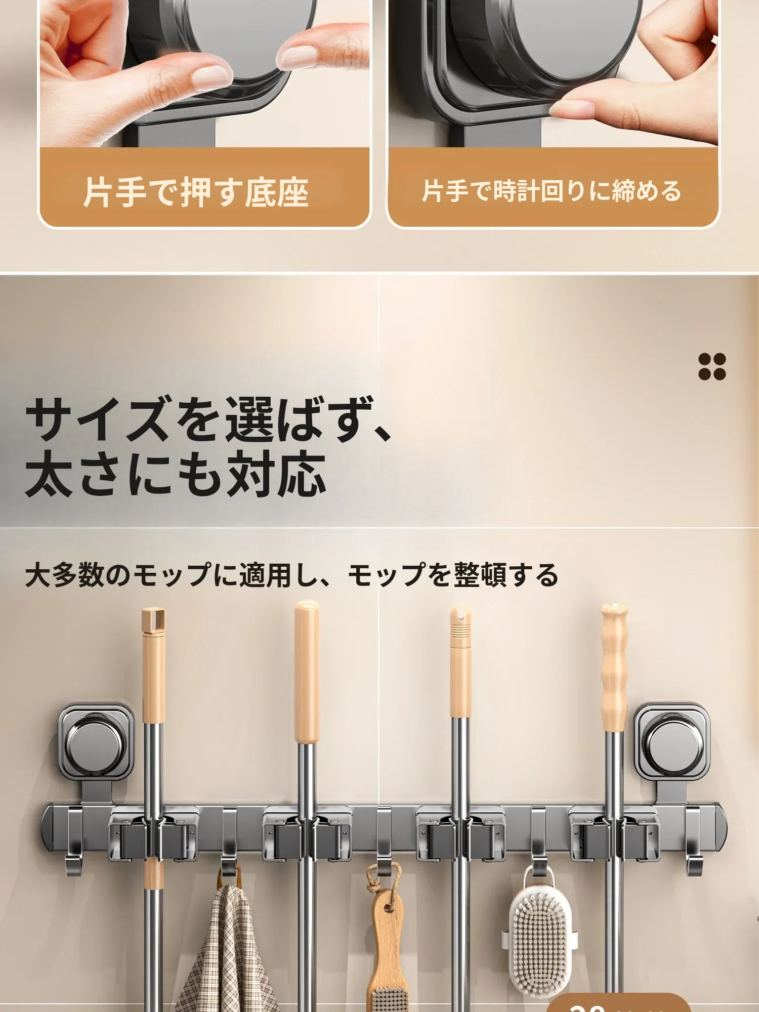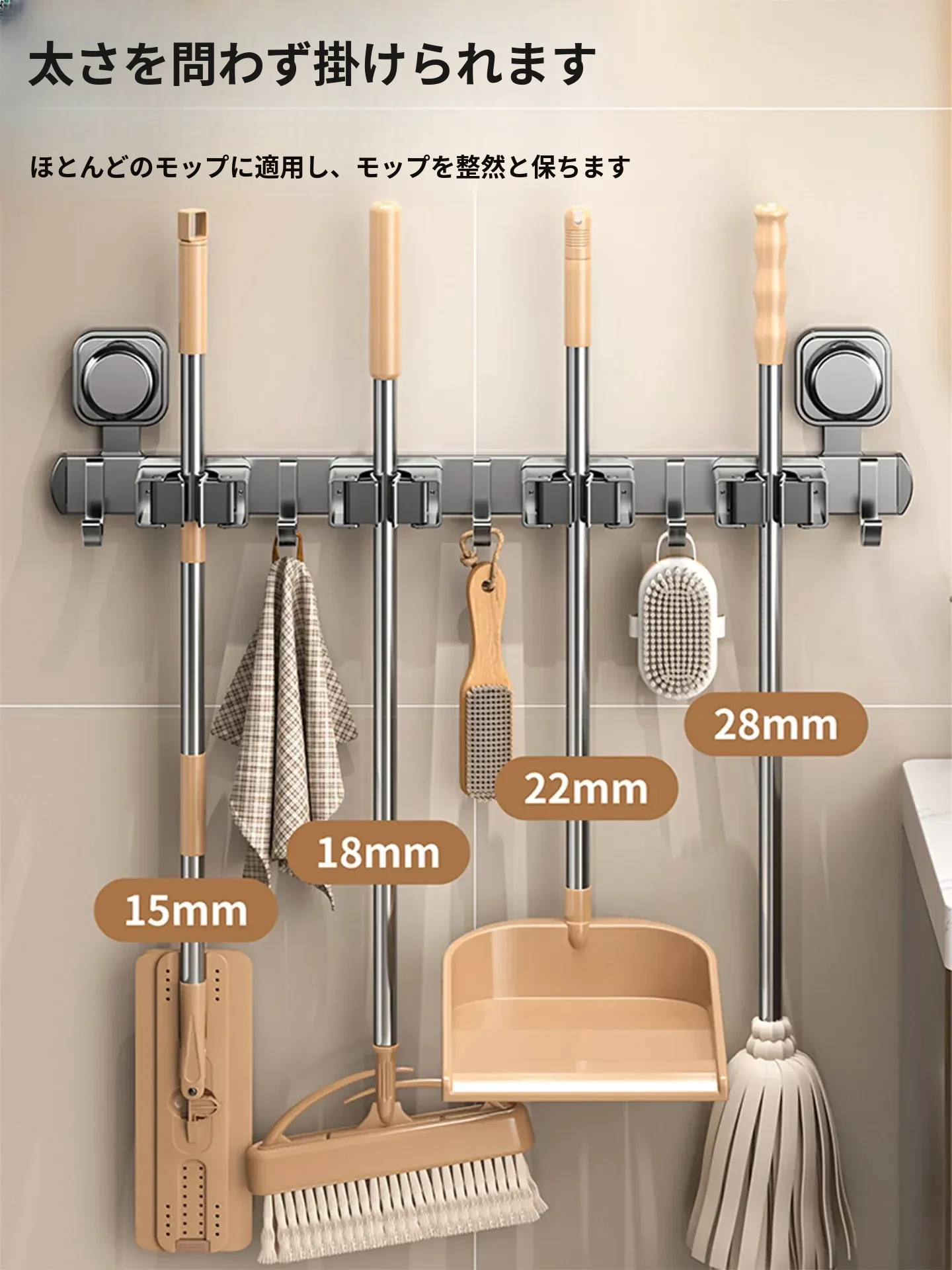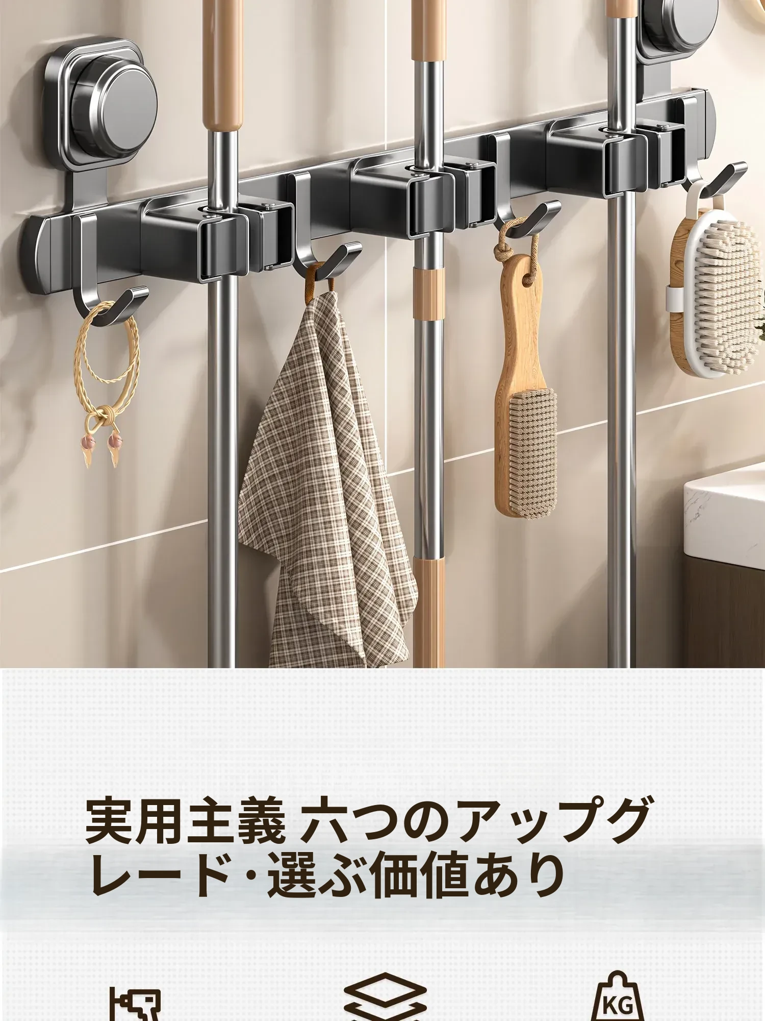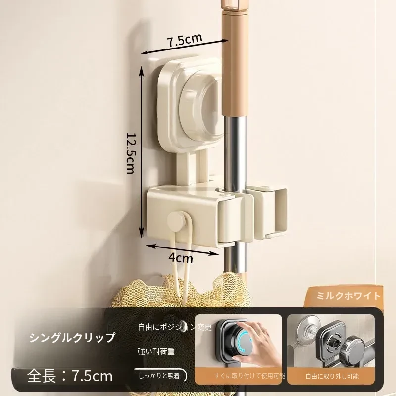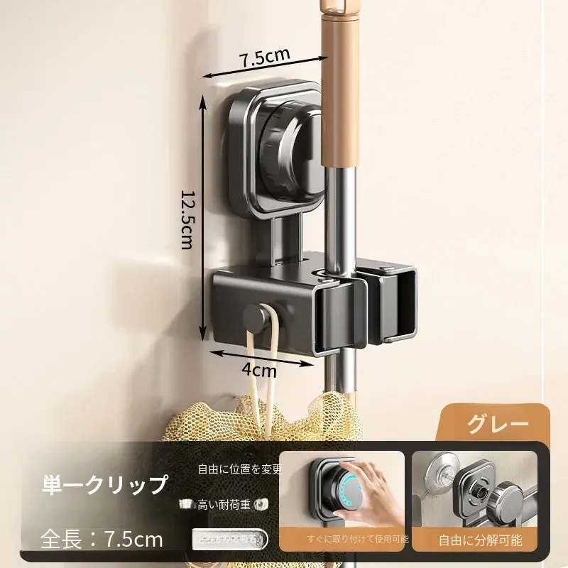 吸盤モップホルダー 壁掛け式 簡単取り付けの収納ラック お風呂やトイレに最適な便利グッズ!掃除道具をスッキリ整理して、スペースを有効活用!