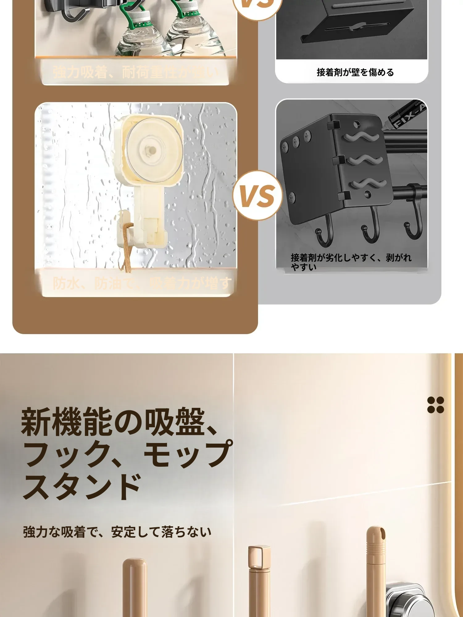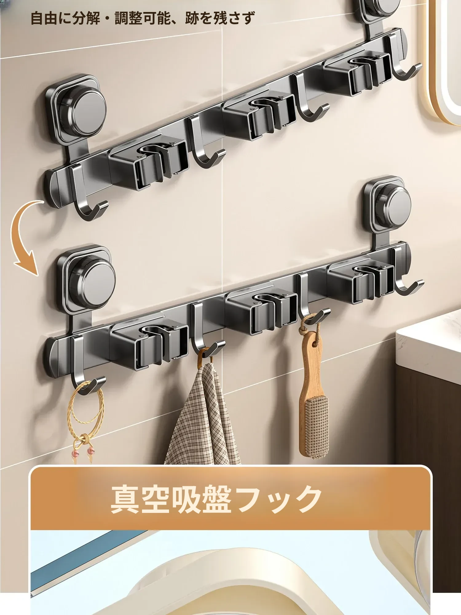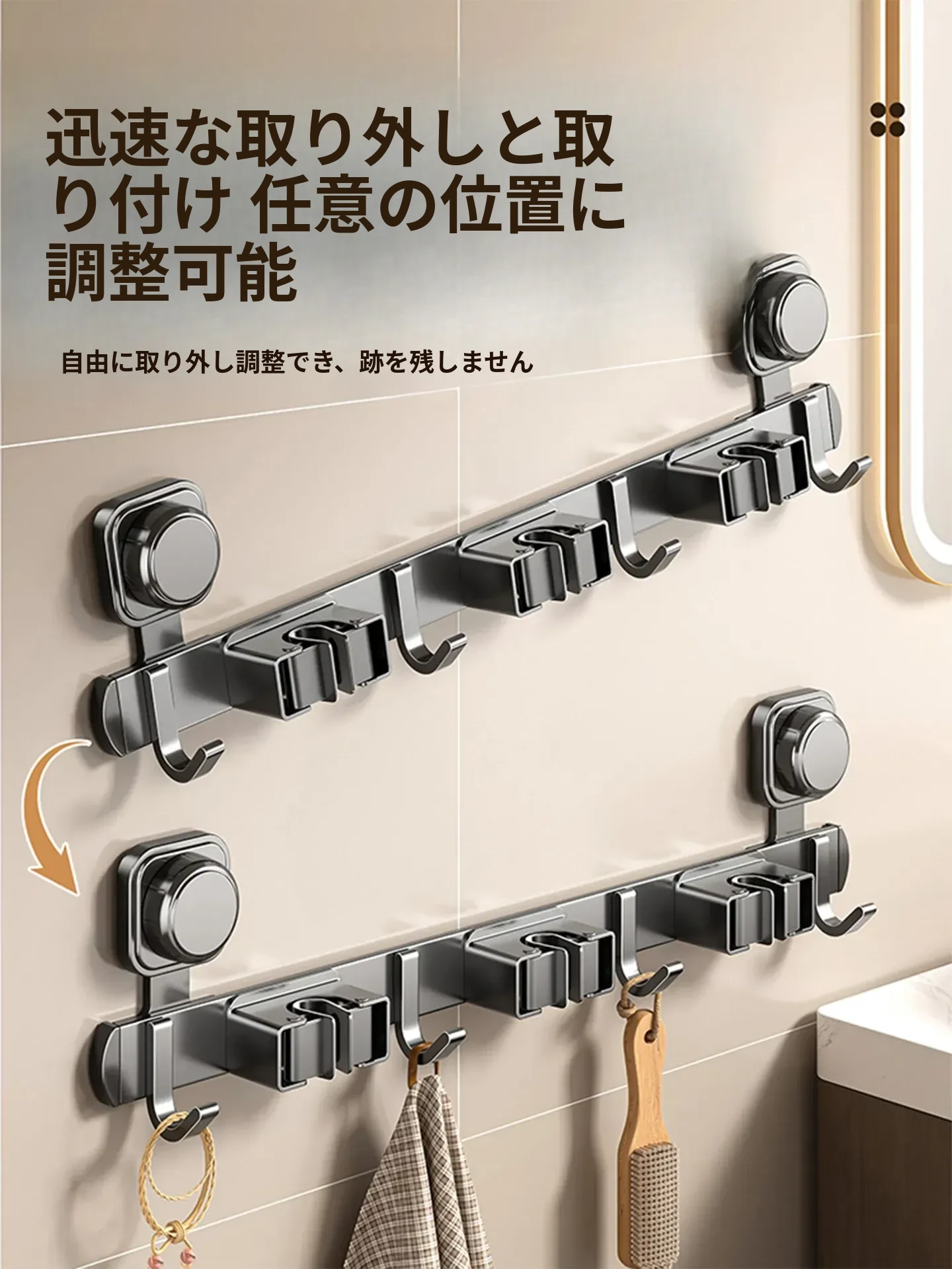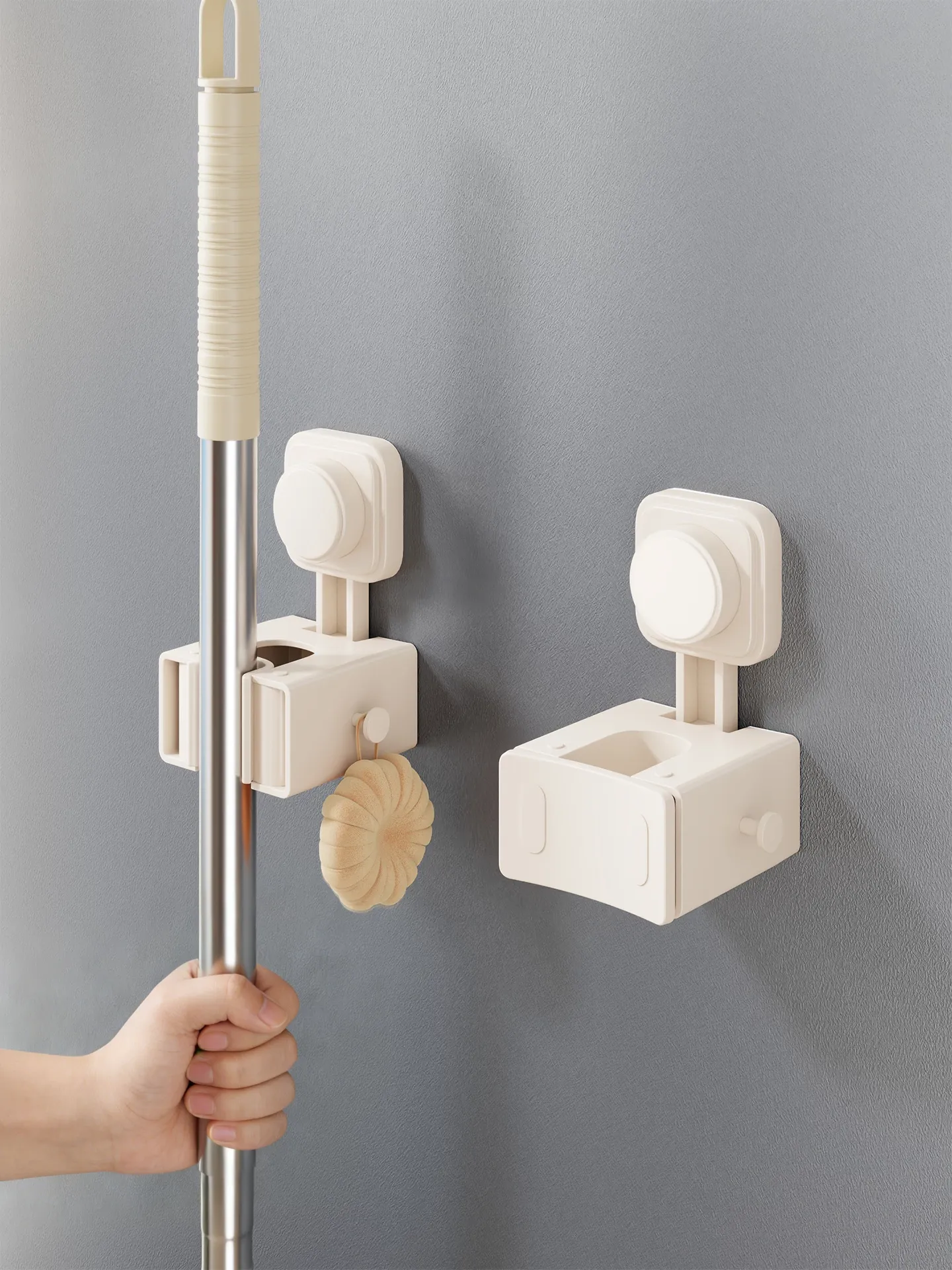 吸盤モップホルダー 壁掛け式 簡単取り付けの収納ラック お風呂やトイレに最適な便利グッズ!掃除道具をスッキリ整理して、スペースを有効活用!