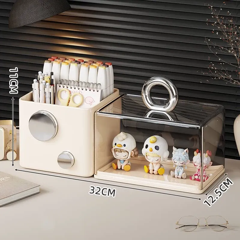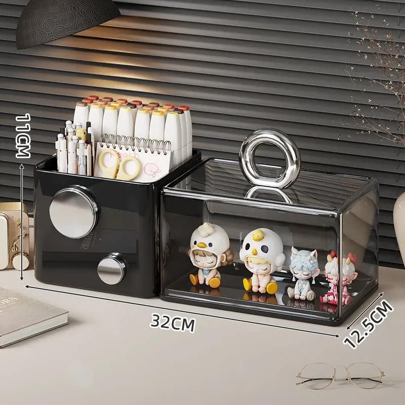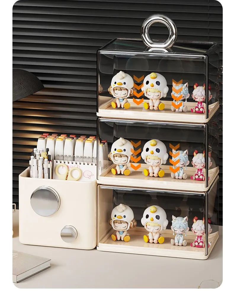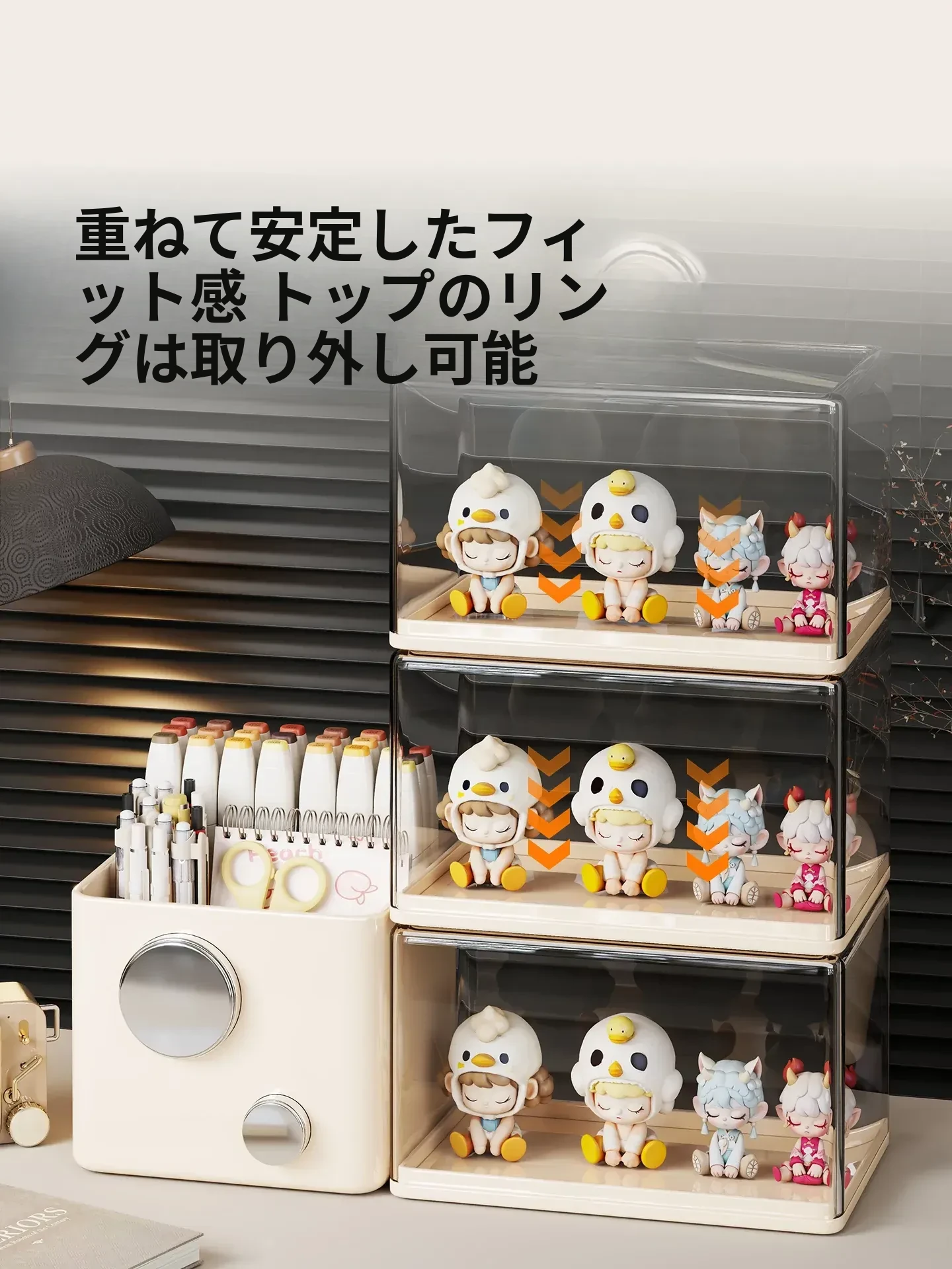 デスク用透明ブラインドボックス収納ボックス | ポップマートフィギュアを美しく展示 | 多機能デザインのクリエイティブペンホルダー | おしゃれなオフィスデスクに最適!