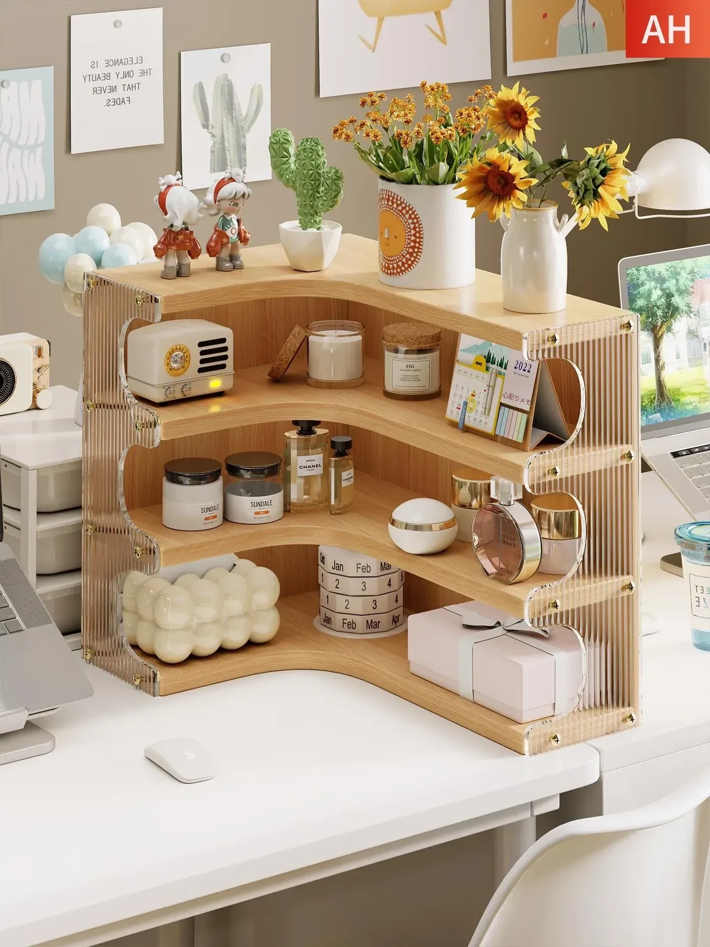 オフィスデスク用コーナー収納ラック - デスク上のスナック整理に最適!アクリル製カップホルダー付きのコンパクトな多層収納シェルフ。作業スペースをスッキリ整理し、効率的な作業環境を実現!